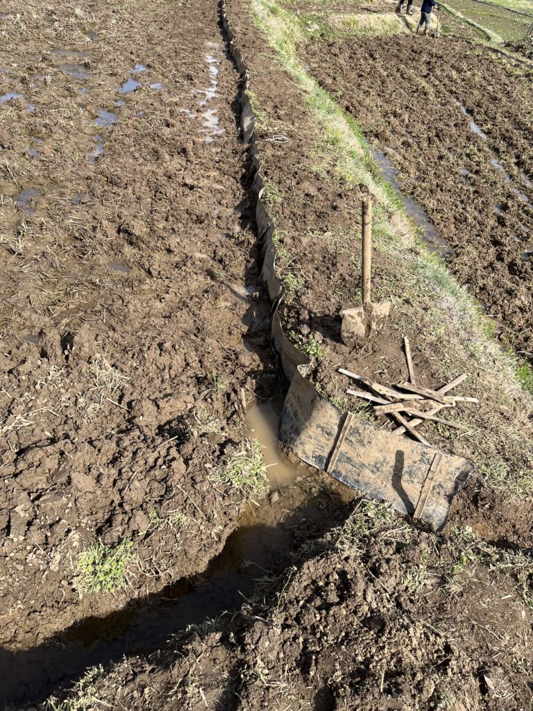 水が流れるルートができて、あぜシートの貼り付けも完了です。