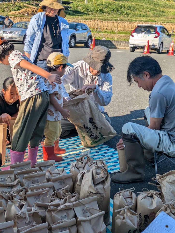 出来上がった玄米を米袋に分配。ここでも、子どもたちが大活躍です。