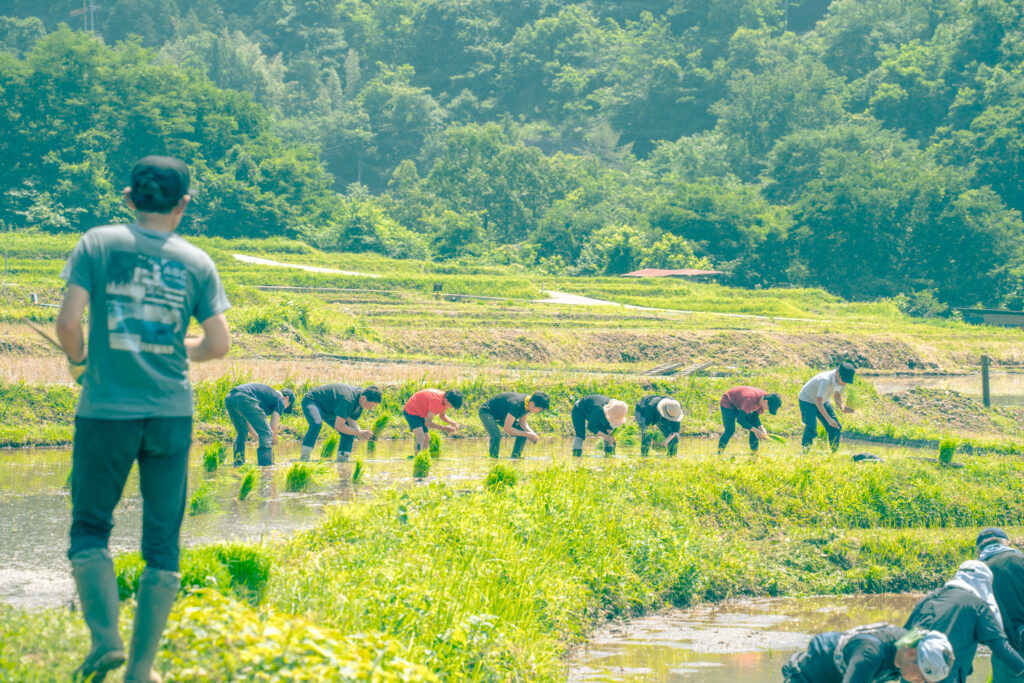 田植えに慣れてくると、作業全体がまるで一つのチームプレイ。木の棒と、縄をガイドに、苗を一定間隔で植えていくことで田んぼが少しずつ緑に染まっていきます。