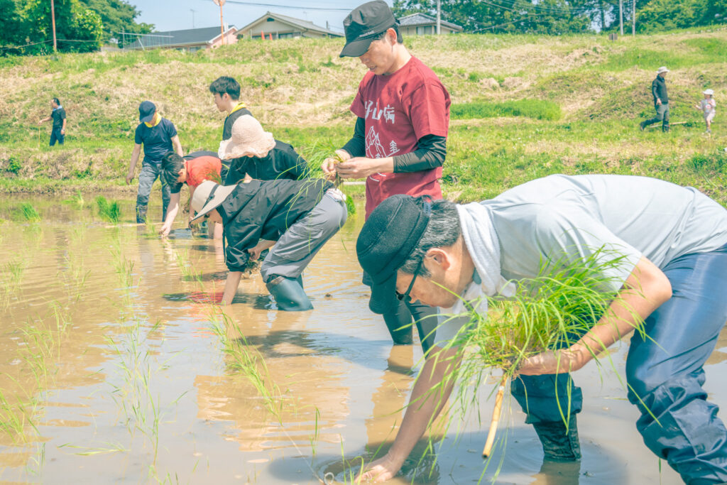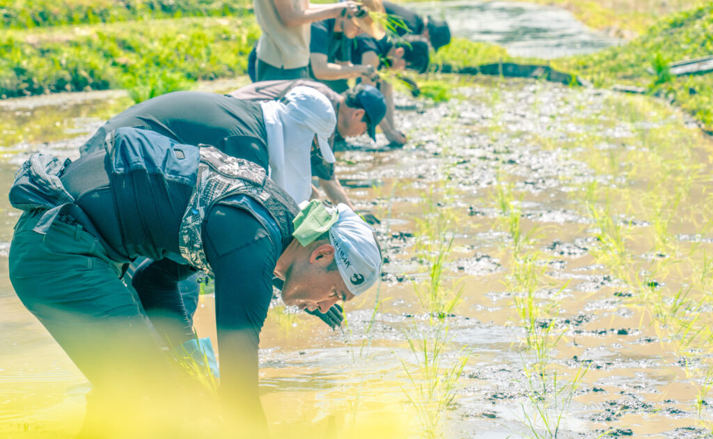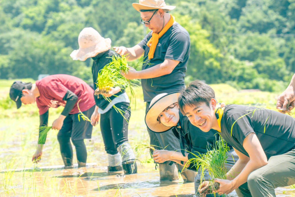 稲の収穫までの第一歩を、みんなと協力してスタート。人生初でもある田植え作業は新鮮そのもので、ご家族で参加される社員の方もいて、終始和やかでのどかな雰囲気が漂っていました。
