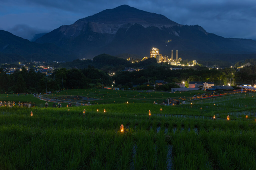 棚田の斜面には、無数の灯籠やランタンが並びます。