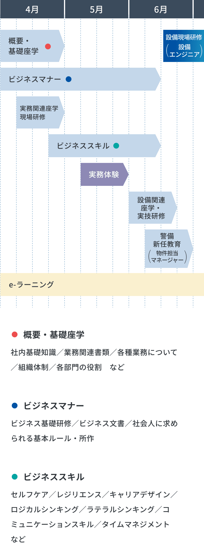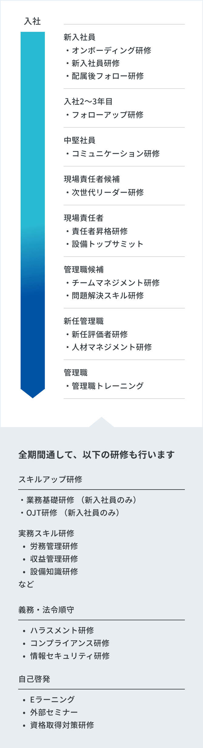 入社後のキャリアステージに応じて、階層別・職能別に多様な研修を実施しています。現場での経験を積みながら、必要な知識・技術・マネジメントスキルを体系的に身につけることができるよう、各段階でフォローアップを行います。