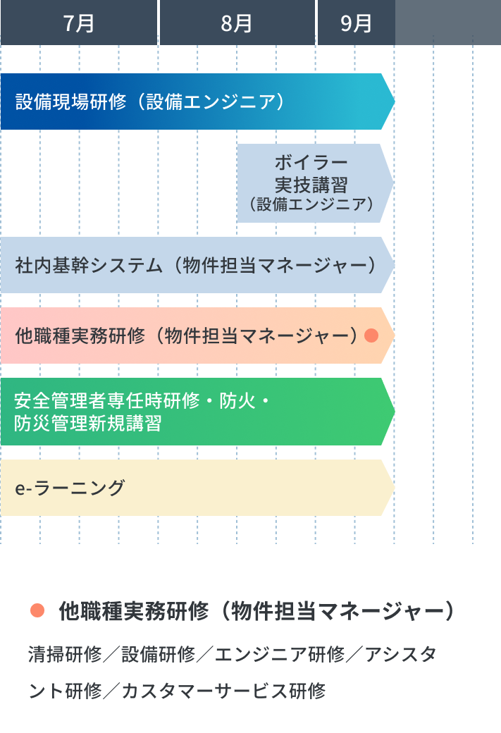 建物の管理業務に必要な設備、品質管理、管理費用などに関する知識を習得することを目的に、複数回に分けて体系的に研修を実施しています。