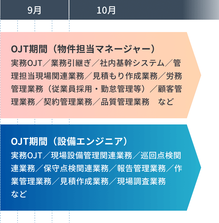 併せて実際に当社が管理する施設見学や現場実習を通して「ビルメンテナンスとは」といった専門的な部分を経験し様々な知識を少しずつ習得し、研修期間の後半では仮配属先研修として本配属後に勤務する予定の部署でのOJT①を行います。