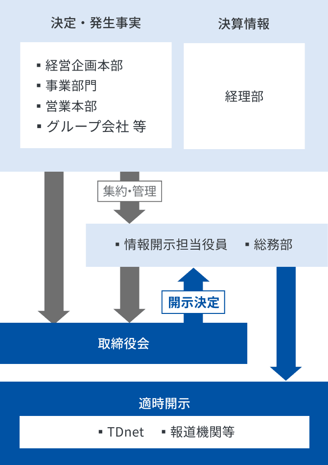 情報開示担当役員(総務部担当執行役員)のもと、総務部が情報開示の主管部署として業務を担当しています。また、社内体制のチェック機能として、監査等委員と内部監査部が連携し、内部管理体制の整備と向上を図っています。