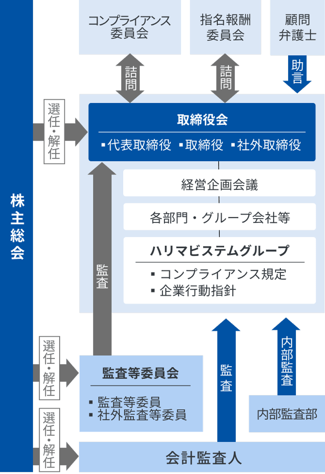 コーポレート・ガバナンスの充実は経営の最重要課題の一つです。ハリマビステムでは経営の透明性を高め、監督機能の強化と意思決定の迅速化を図ることによって、企業価値の向上を目指しています。