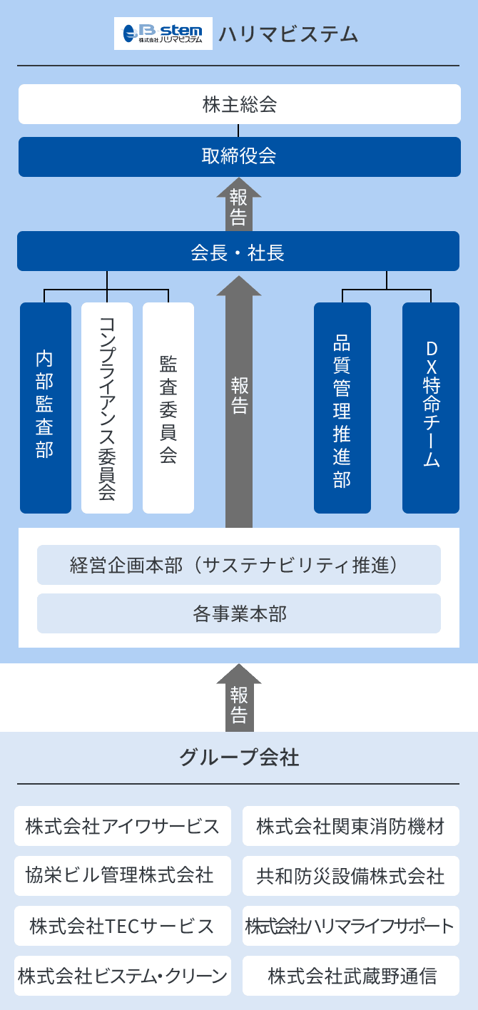 代表取締役社長は直轄部署の品質管理推進部やDX特命チームと連携し、サステナビリティ全般の対策の取り組み状況を取締役会に報告する責任を担っています。経営企画本部は、ハリマビステム内はもちろん、グループ全体で環境課題への取り組みするための横断的な役割を担っています。