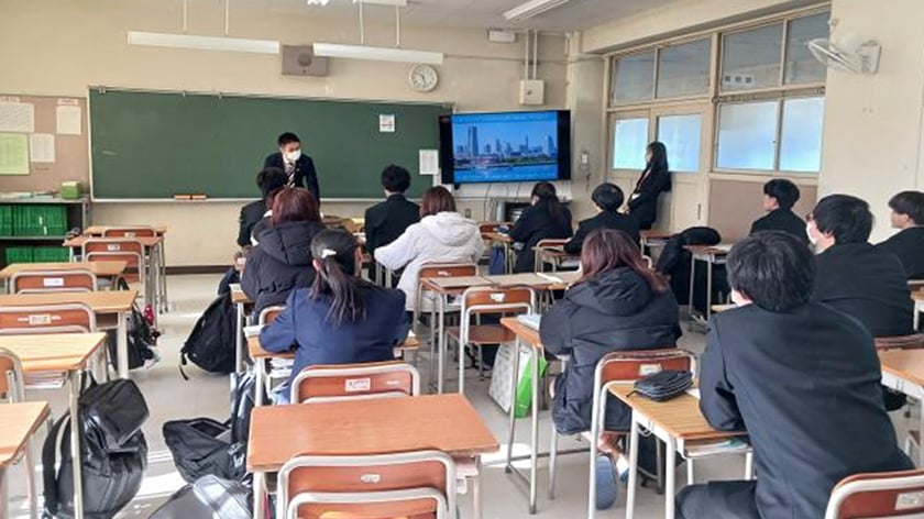 SDGs活動の一環として、ユネスコの理想を実現するため平和や国際的な連携を実践する学校『ユネスコスクール加盟校』で開催されている、社会貢献活動を実践する企業や団体等の活動をプレゼンテーションする機会に積極的に参加しています。プレゼンテーションではグループ会社にて製造している環境型洗剤の汚れ除去の実演を行い、生徒の皆様に文字や写真で見るより、ダイレクトにイメージを伝える工夫を行っています。